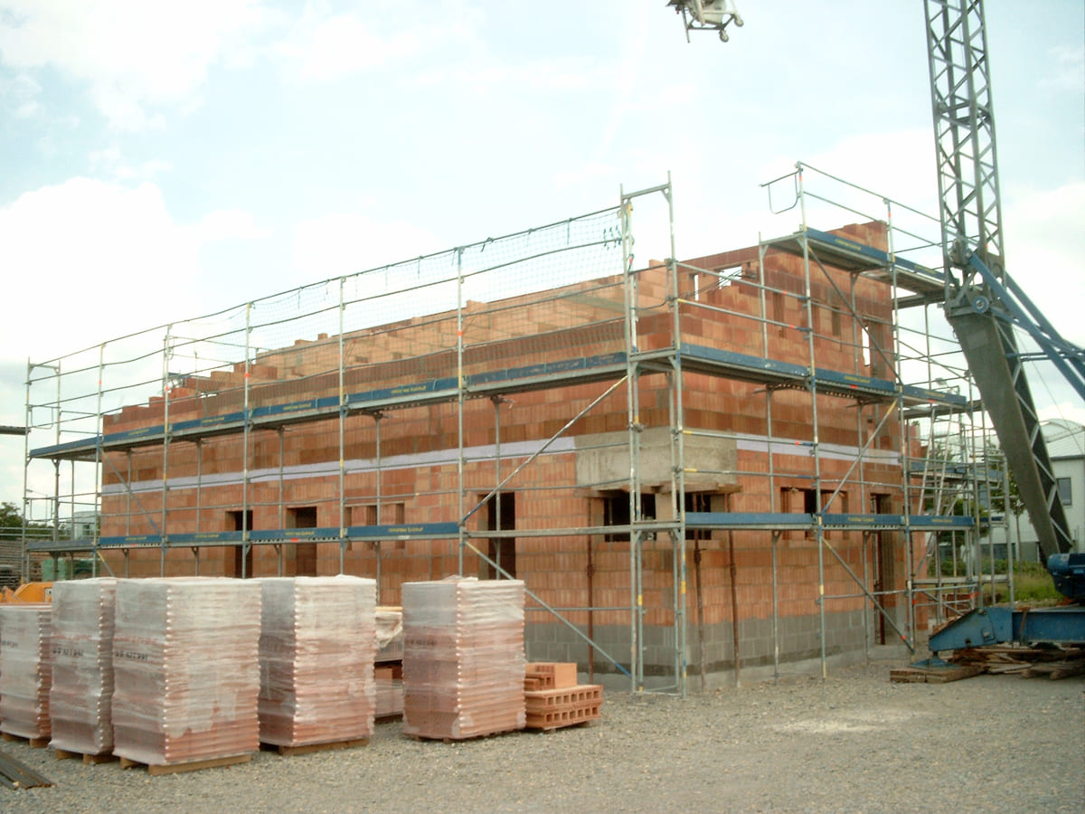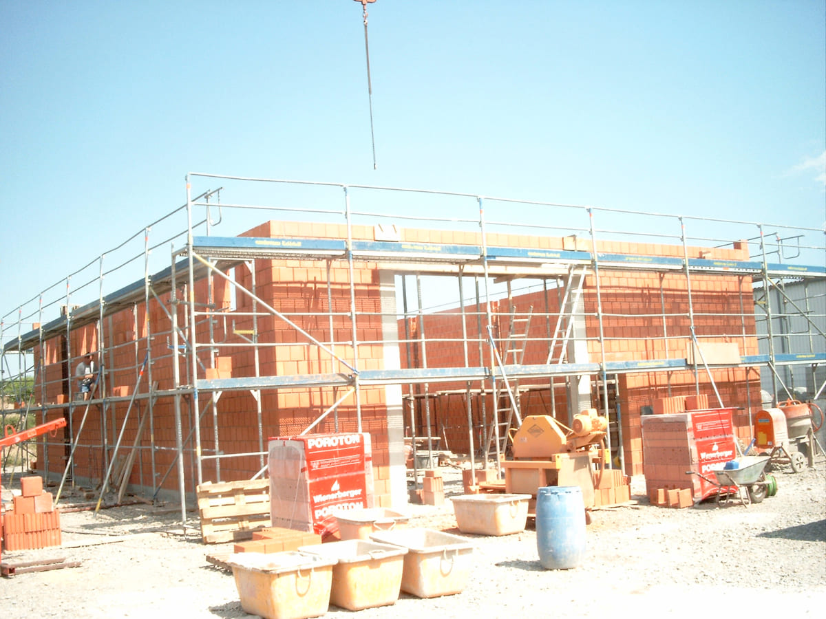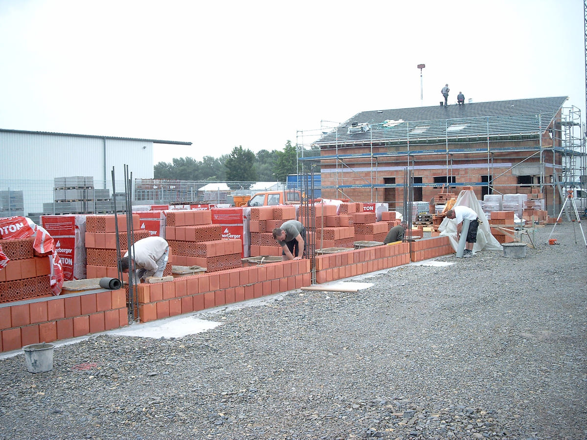 Folgende Leistungen können wir anbieten: Verlegung der Kanalrohre für den Abwasseranschluss, Herstellen der Fundamente und der Bodenplatte, Wände mauern, Decken legen – kurzum alle Arbeiten bis zum Dachstuhl. Ist ein Schornstein eingeplant, gehört auch dieser zum Rohbau.